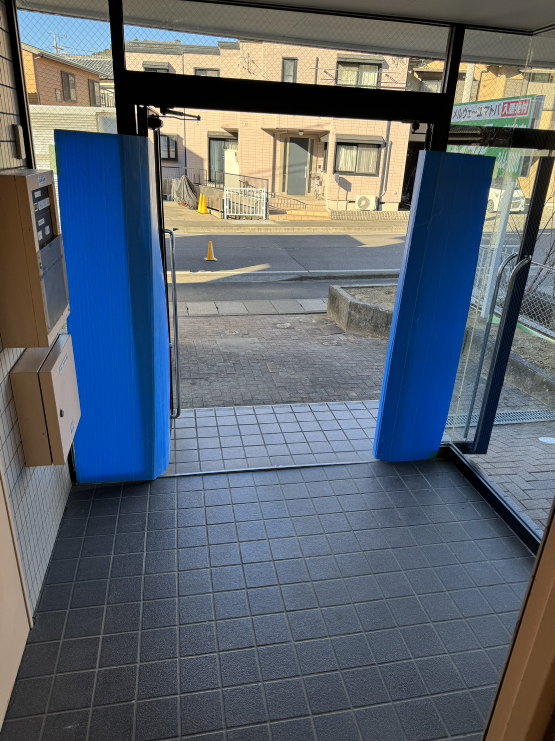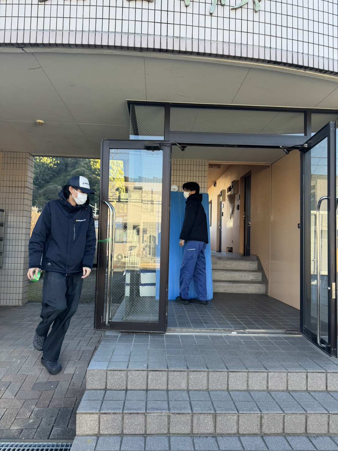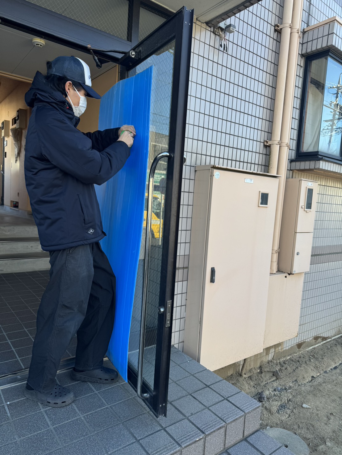 今回は出入口のガラス面や動線を中心にしっかりと養生を行い、建物や他の入居者様へご迷惑がかからないよう万全の体制で作業を進めました。