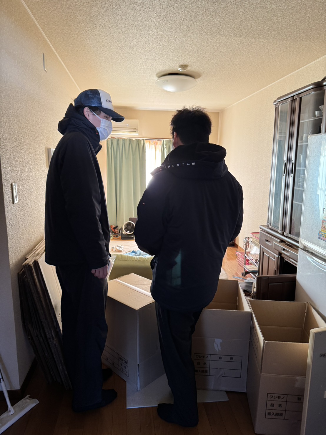 室内では床や壁を傷つけないよう、養生材を敷いたうえで段ボールの集約・搬出準備を実施。
